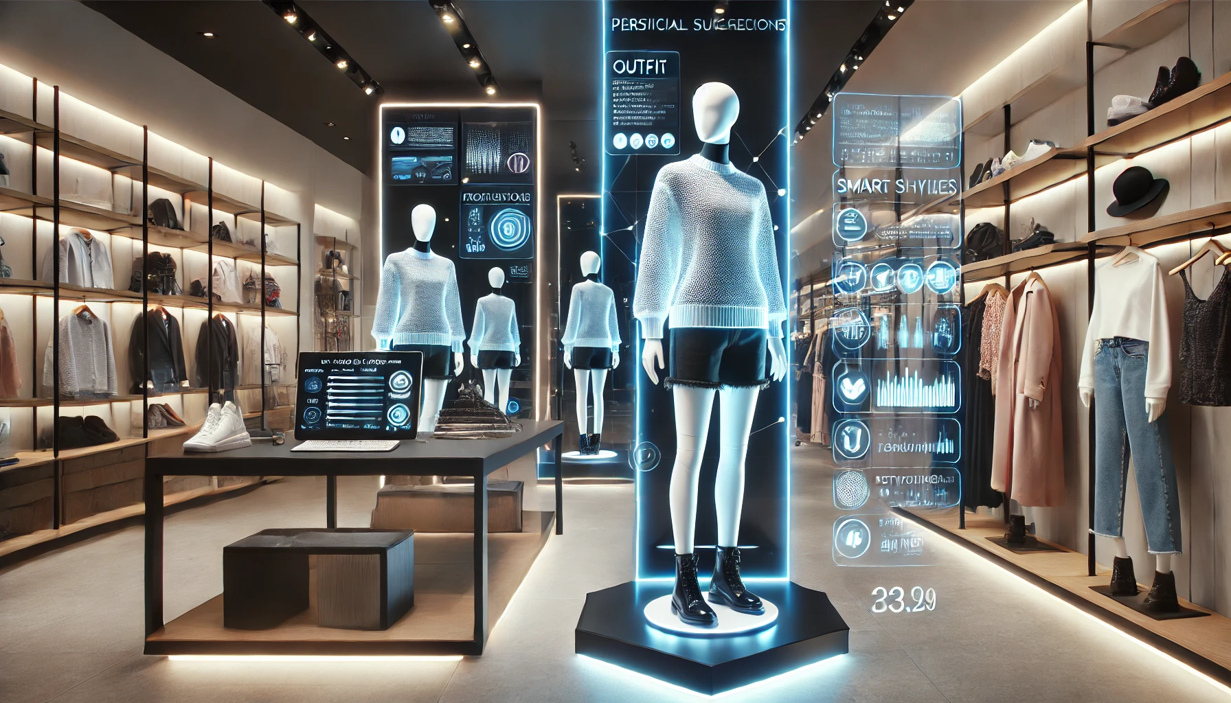 A high-tech fashion retail store using artificial intelligence. Interactive mirrors display outfit suggestions based on customer preferences. Smart sh