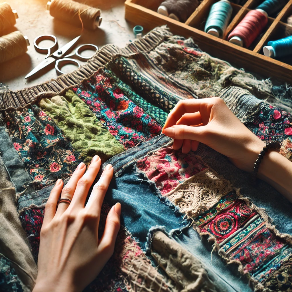 A detailed close-up of hands repurposing old clothing into stylish new fashion pieces, such as sewing a patchwork dress from recycled fabric. The scen