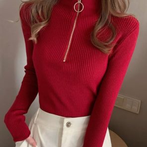 2022 Knitted Women Zipper High Neck Sweater Pullovers Turtleneck Autumn Winter Basic Women Sweaters Slim Fit Black Pull Femme