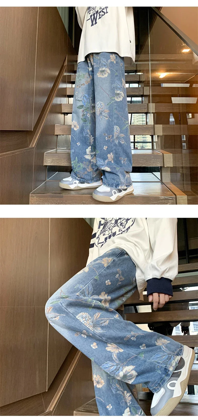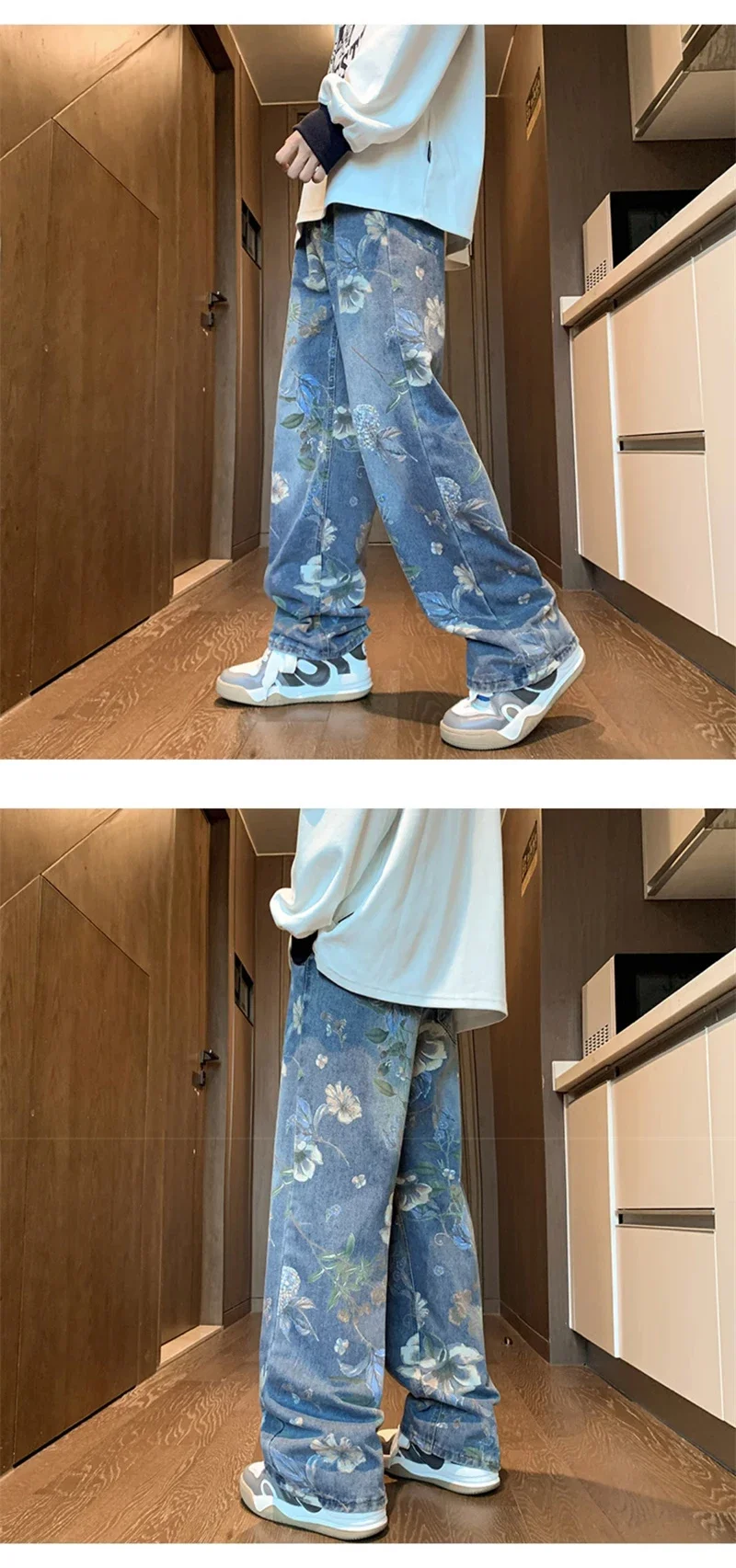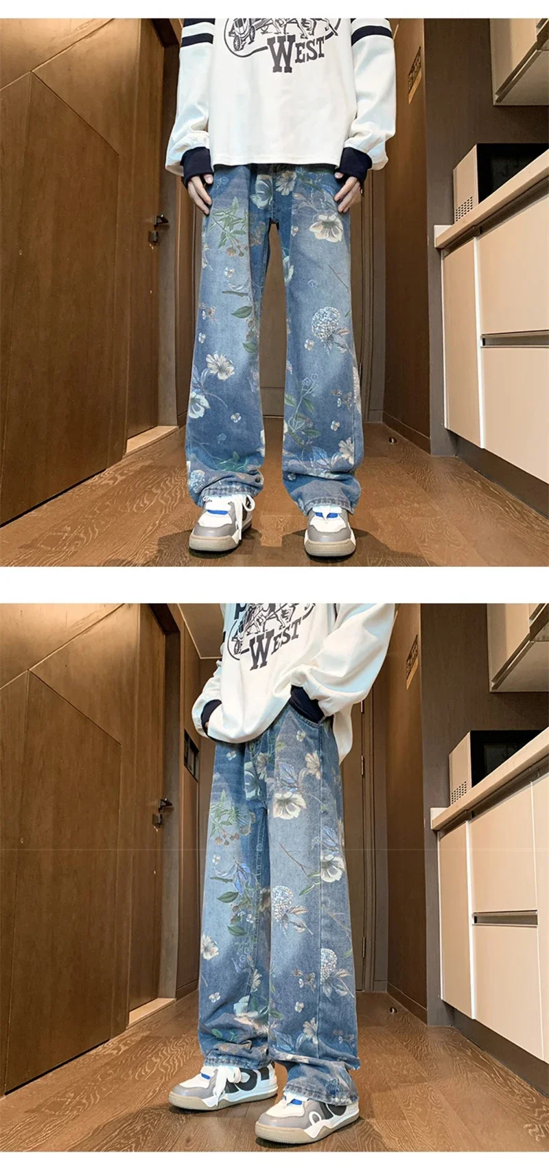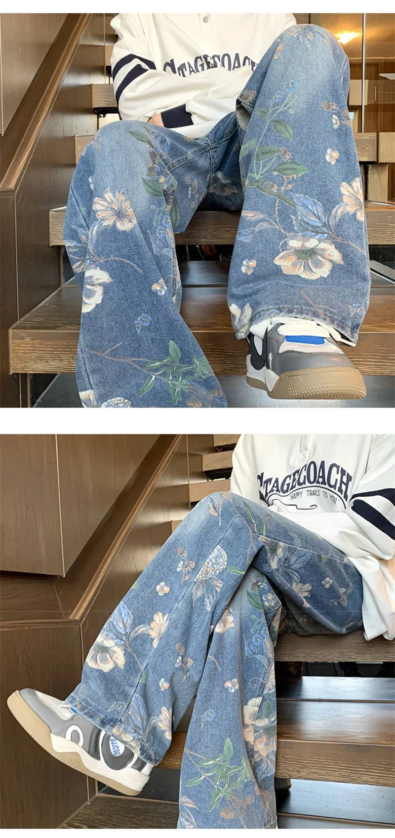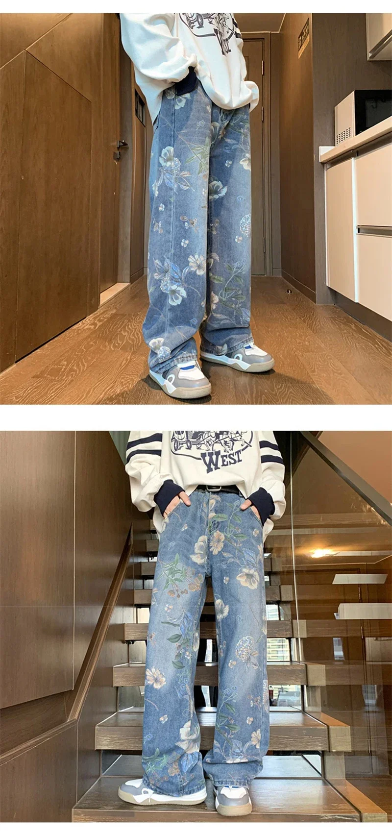 Autumn Floral Printed Jeans for Men – Y2K Vintage Denim Baggy Wide-Leg Streetwear Pants