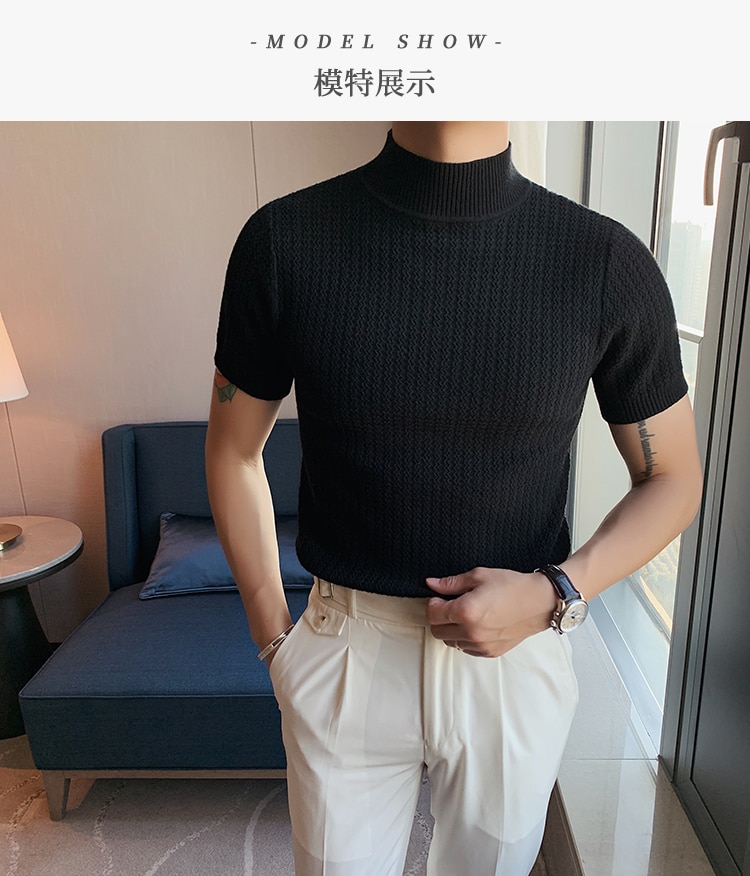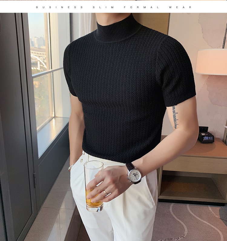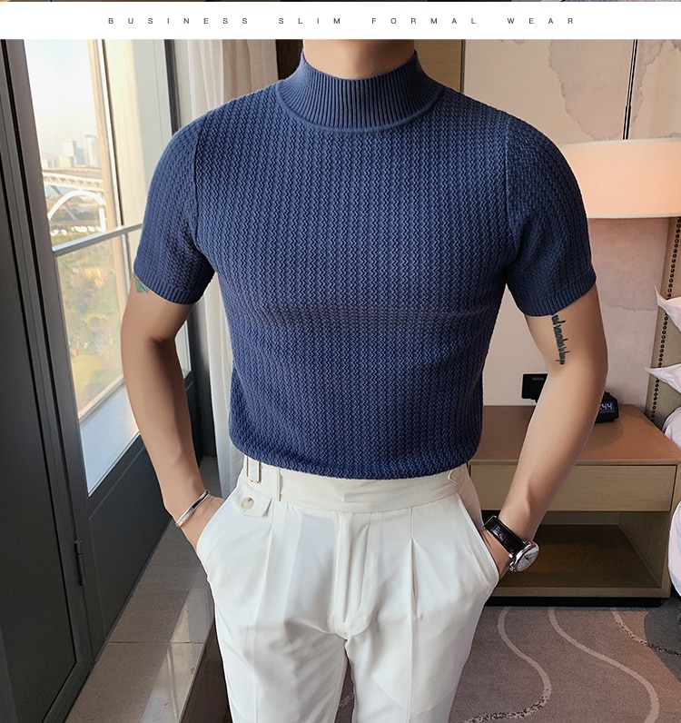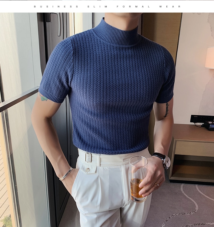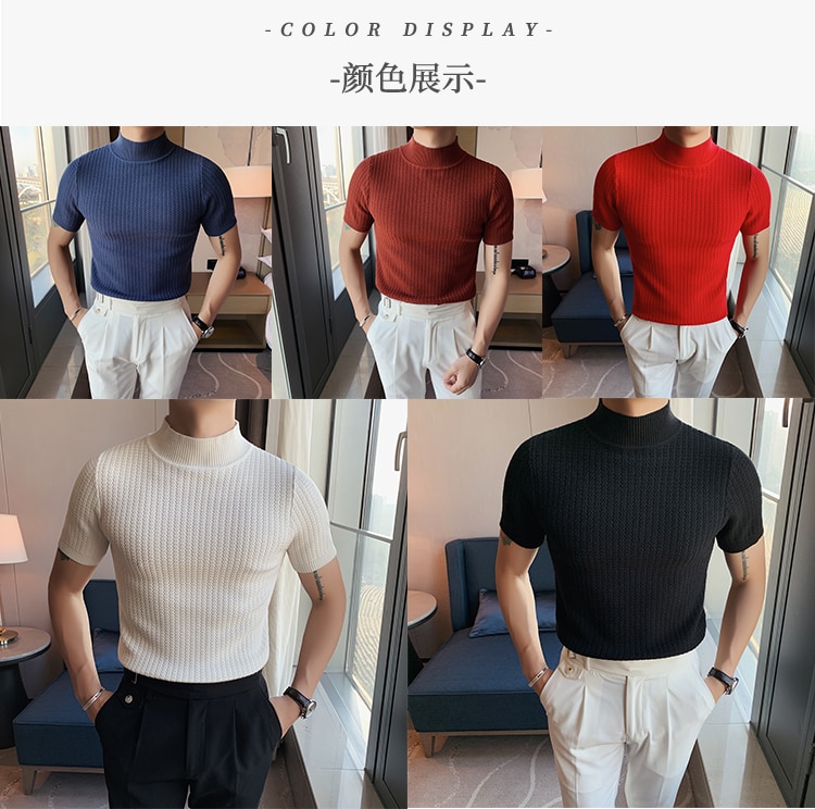 Autumn New Short Sleeve Knitted Sweater Men Tops Clothing 2022 All Match Slim Fit Stretch Turtleneck Casual Pull Homme Pullovers