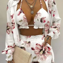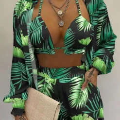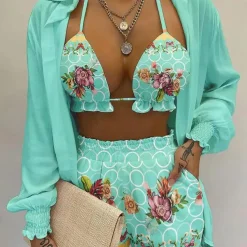 Bring effortless elegance to the beach in this green floral 3-piece bikini set.