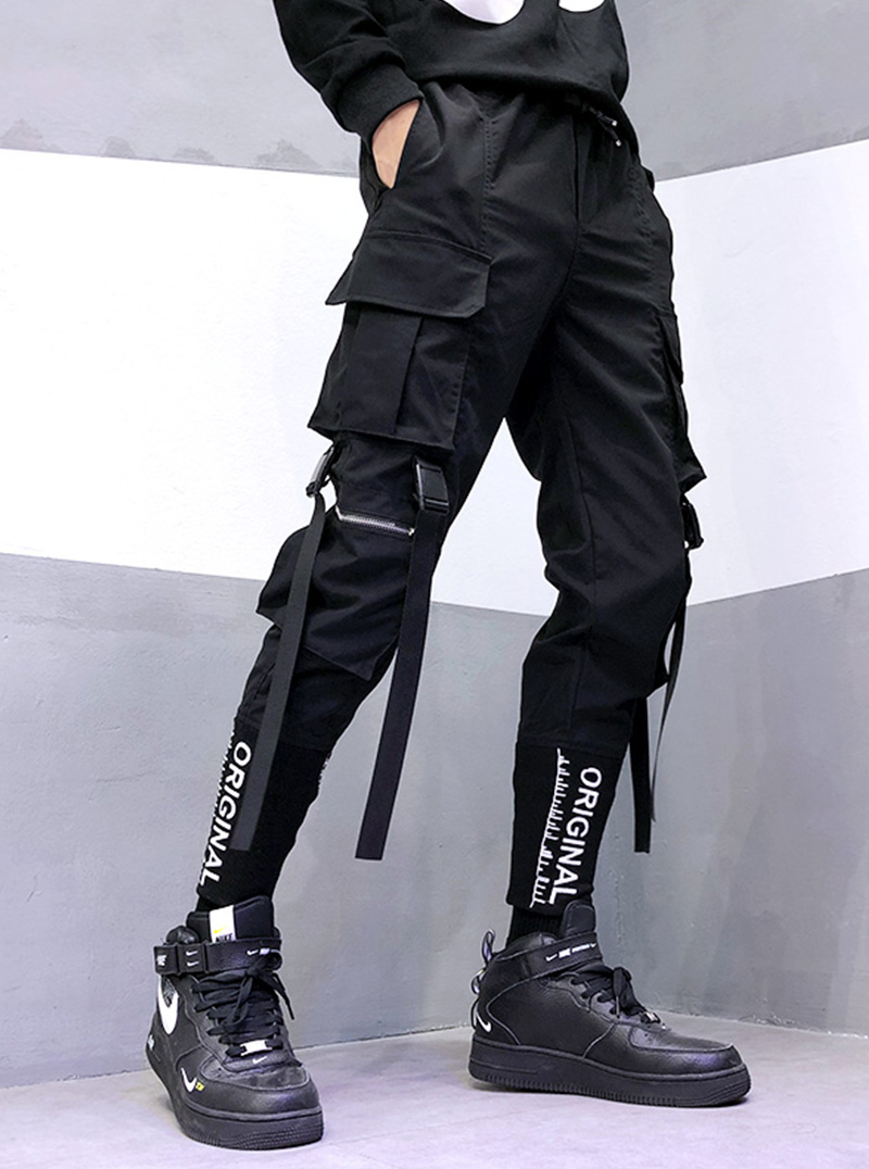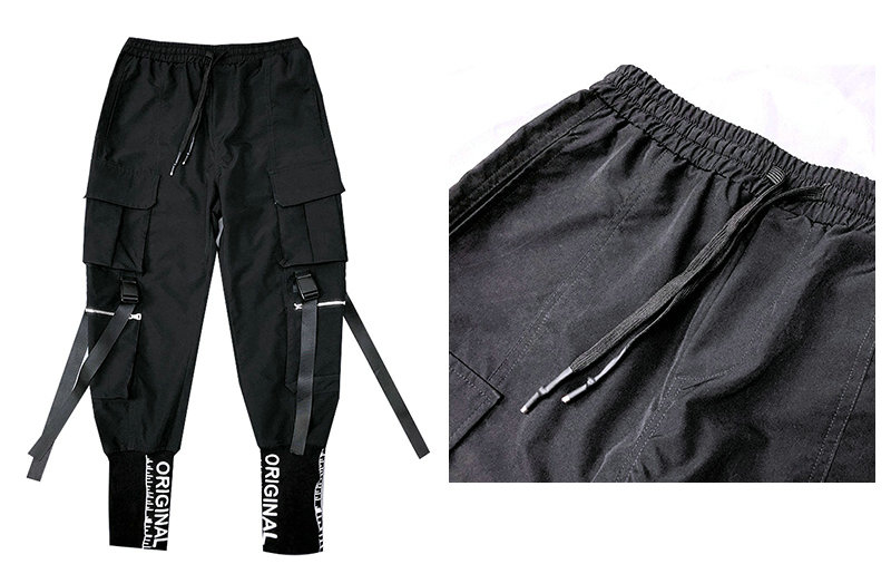 Hip Hop Men Ribbons Cargo Pants Fashion Harajuku 2022 New Elastic Waist Casual Streetwear Mens Joggers Trousers Black