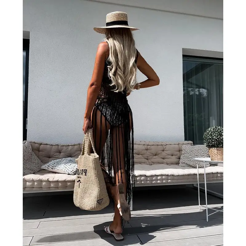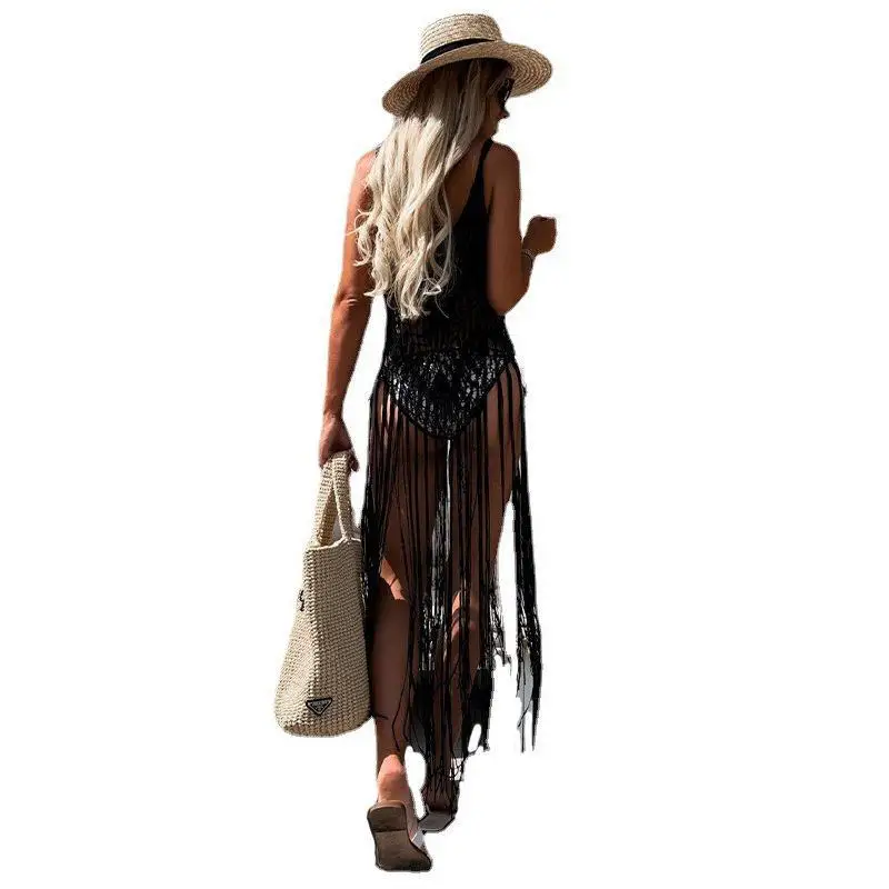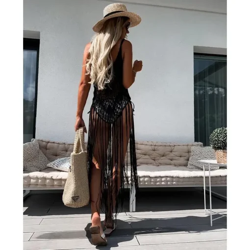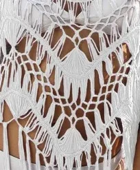 Step into summer with confidence in this sexy hollow-out beach cover-up, designed to make waves at every seaside escape. Hand-hooked with precision and elegance, this long tassel cover-up shirt blends style and function, giving you breezy coverage without hiding your beach glow.
