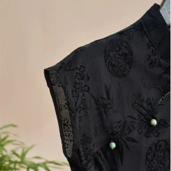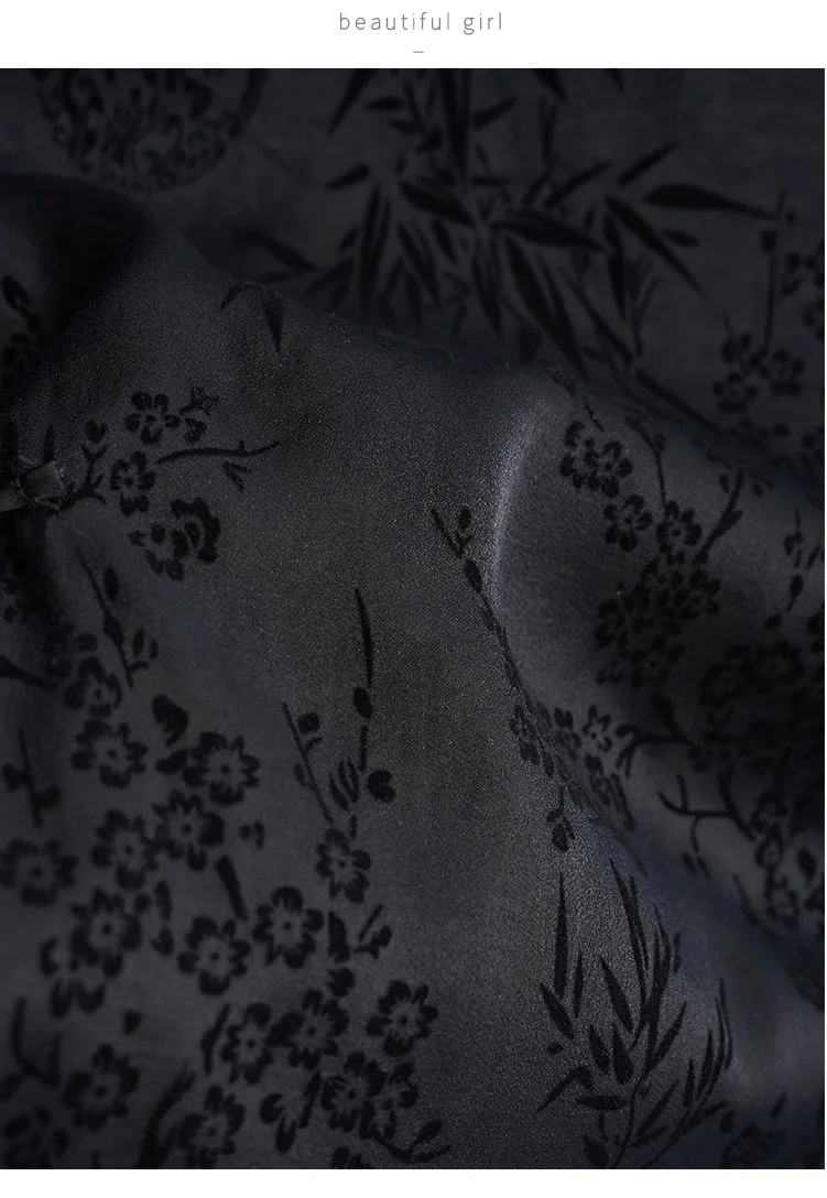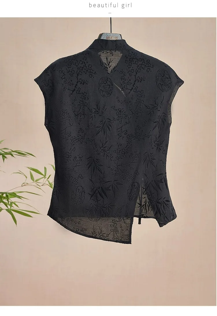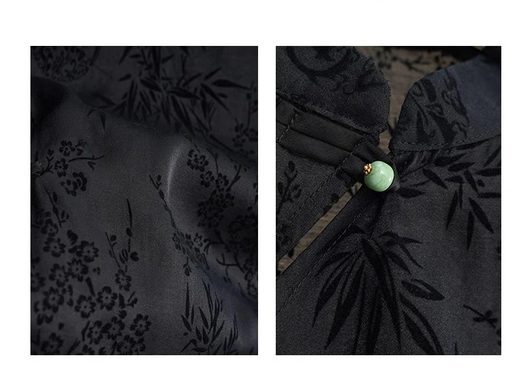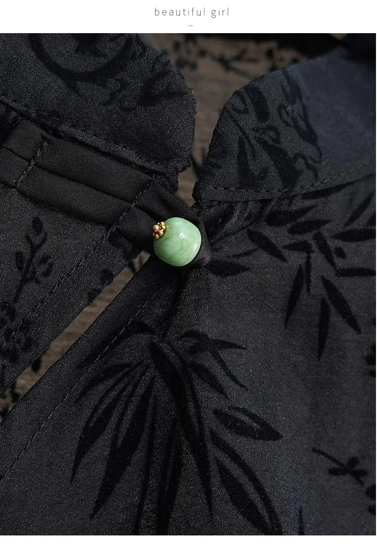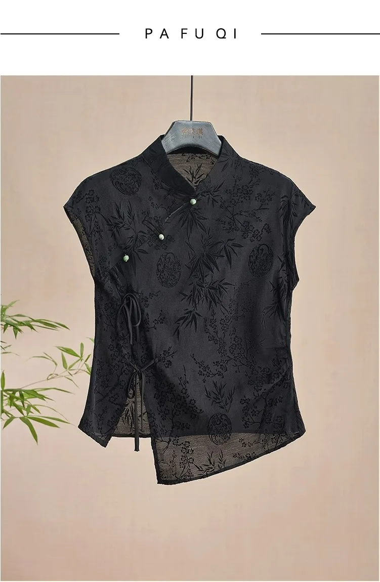 Elevate your summer wardrobe with this elegant retro-inspired Chinese style cheongsam top. Featuring a sleek black jacquard design, this short-sleeve shirt embraces a modern take on traditional fashion. Made from lightweight chiffon fabric, this top is perfect for warm-weather outings, offering a graceful blend of comfort and style.