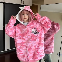 Sanrio Hello Kitty Y2K Jacket – Zipper Cardigan Hoodie, Camouflage Blouse Sweatshirt, Autumn Long Sleeve Couple Jacket for Women