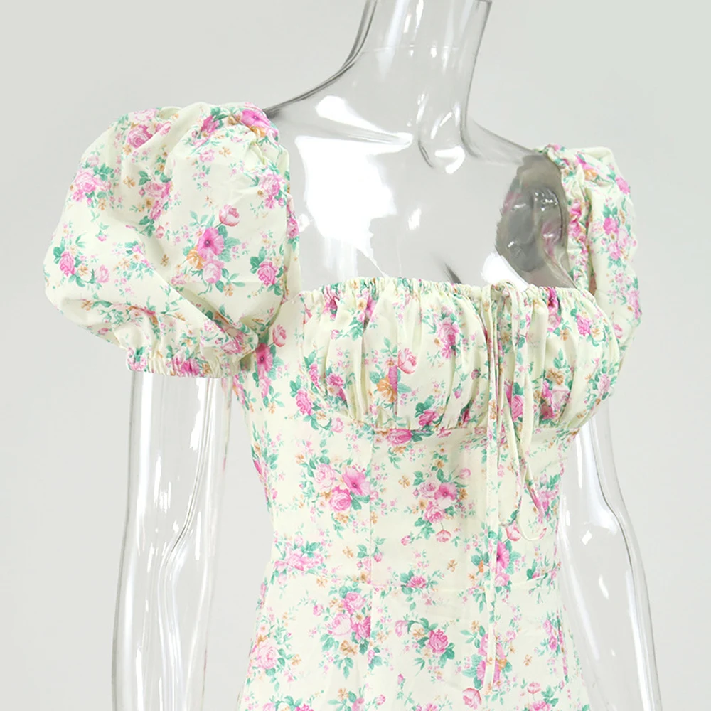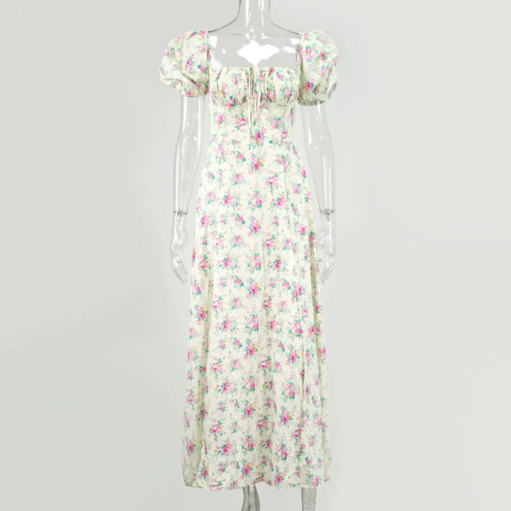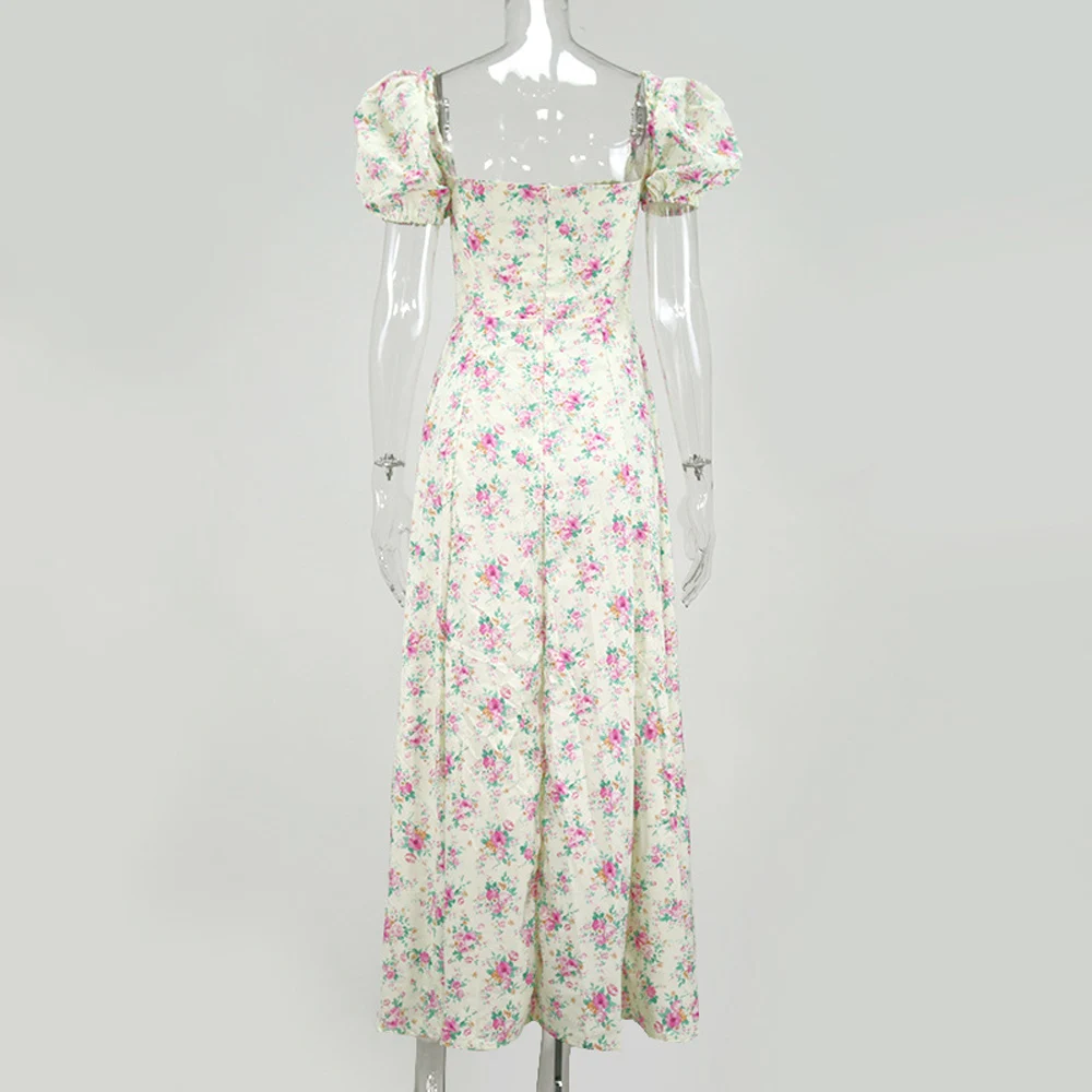 Summer Women’s Puff Sleeve Floral Printed Dress – Elegant White A-Line Midi Dress