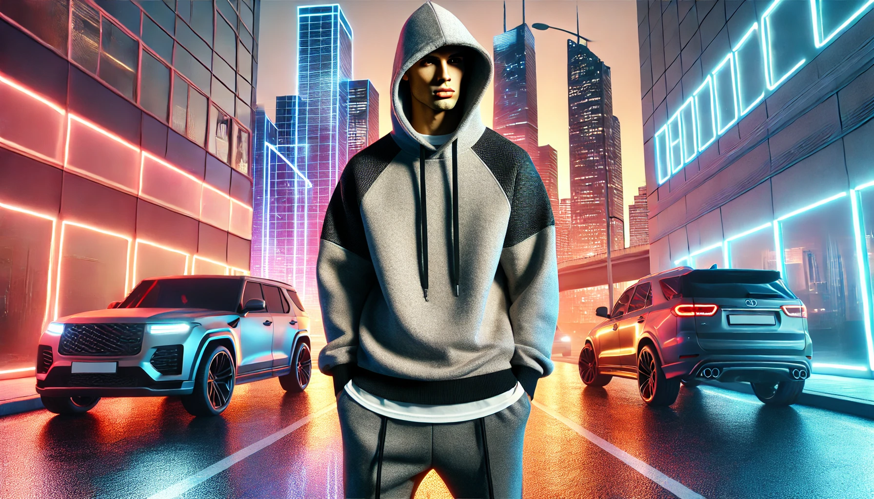 A stylish urban scene featuring a trendy oversized hoodie fashion look. A young model wearing a modern, well-fitted hoodie with sleek joggers and high